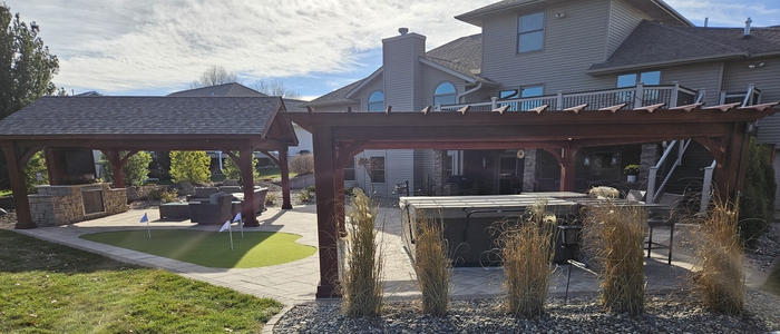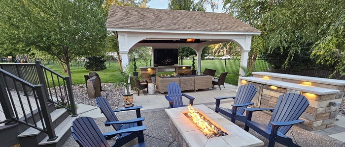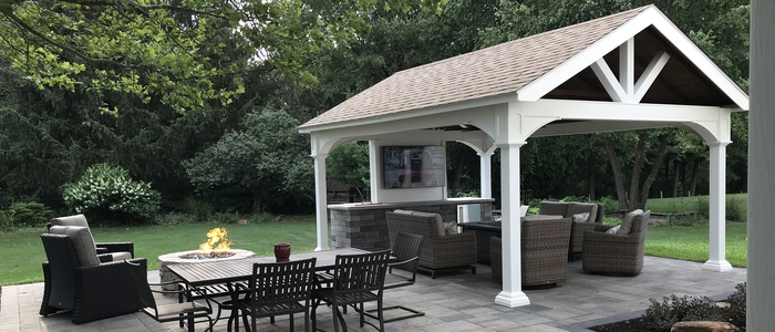 • Inside a beautiful pavilion with entertaining area built by Outdoor Innovations.